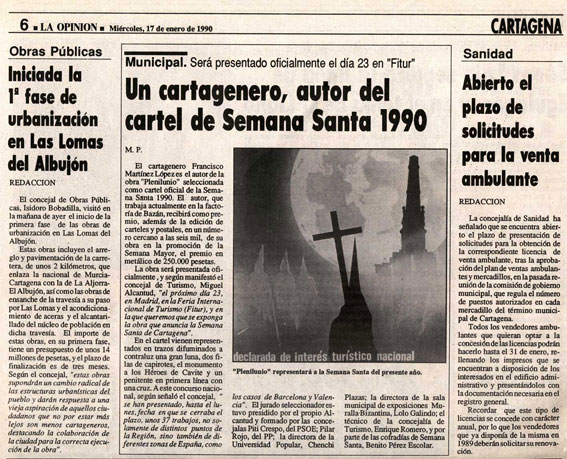 No tenía muchas esperanzas puestas en ganar porque otros carteles de los que me había quedado más satisfecho y habían participado en otros concursos no habían ganado, pero así son las cosas. Con el premio me compré mi primer ordenador personal ¡un IBM nada menos! y empecé a descubrir ese instrumento diabólico del que hoy no puedo prescindir. El premio lo recibí en el Ayuntamiento del Alcalde de Cartagena en aquella época, el cantonal Antonio Vallejo Alberola.