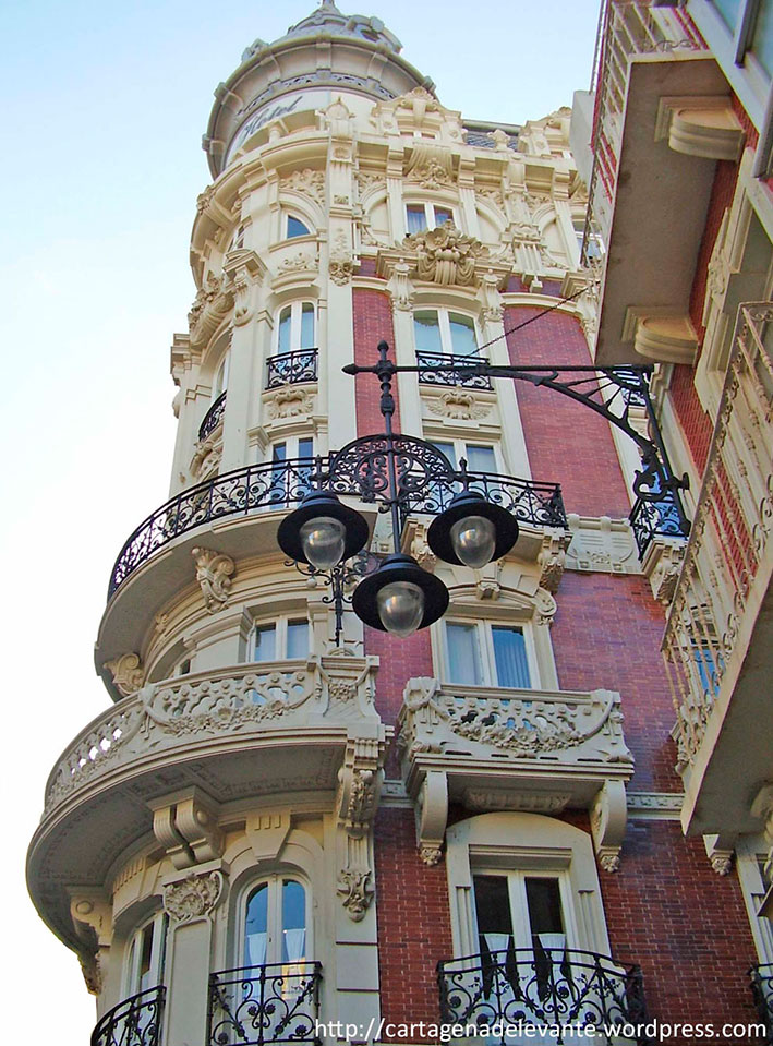 Además de muchos locales, comercios y edificios singulares que ha habido en ella, que yo no recuerdo y que además no es el objeto de este blog, destacan, y por eso si me acuerdo, el periódico El Eco de Cartagena, que estuvo aquí a partir de 1920, y sobre todo, desde un poco antes, en 1916, el edificio del Gran Hotel, del también grande Víctor Beltrí. Afortunadamente éste sigue estando a la vista para disfrute de todos los que quieran recrear la vista en sus líneas ágiles y armoniosas.