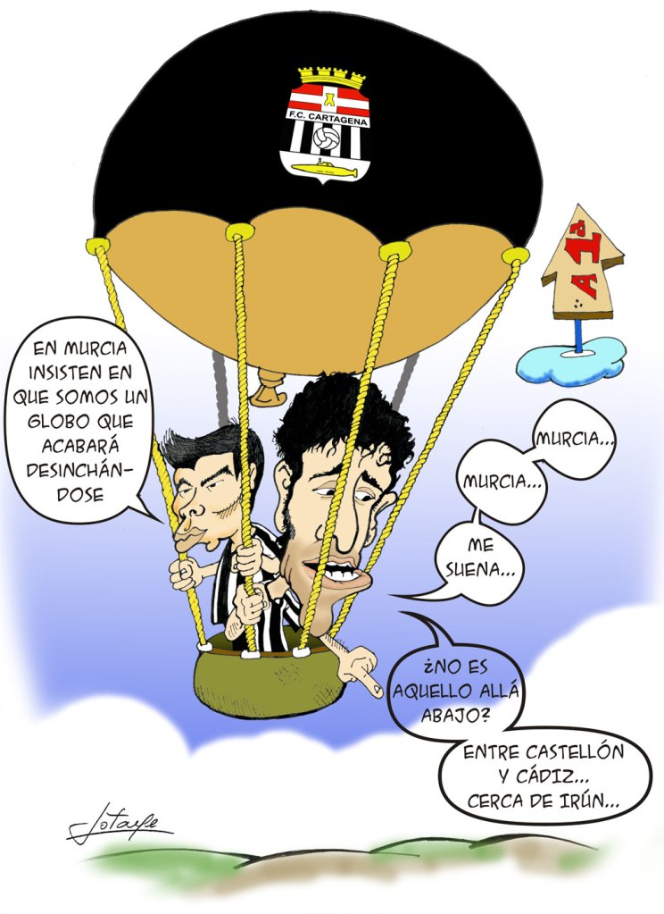 Por eso hice la viñeta del globo, con dos jugadores de la tierra: Yuste y el capi Mariano Sánchez (¿se acuerdan cuando había algún jugador cartagenero en el Cartagena? ¡Qué tiempos!)
