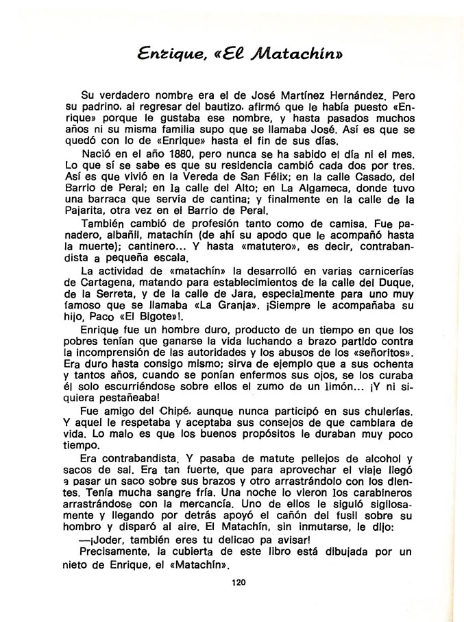 Pero no era así. Un carabinero (el que me contó la historia a mí) lo había visto y, dando un rodeo, fue acercándose con sigilo por su espalda. Una vez allí, sin hacer ruido, levantó la carabina y disparó desde su espalda y por encima del hombro de Enrique. Aquello, en la noche, sonó como un estampido brutal y una persona normal se habría espantado, asustado, habría brincado… algo habría hecho. Mi abuelo, lo que hizo fue volverse tranquilamente hacia el carabinero y decirle, en tono muy cartagenero: «Joer, también eres tú delicao…» El espantado fue el carabinero ante aquella sangre fría, como así me lo dijo.